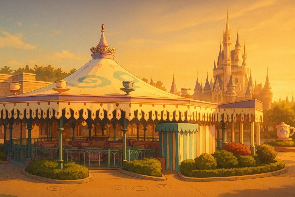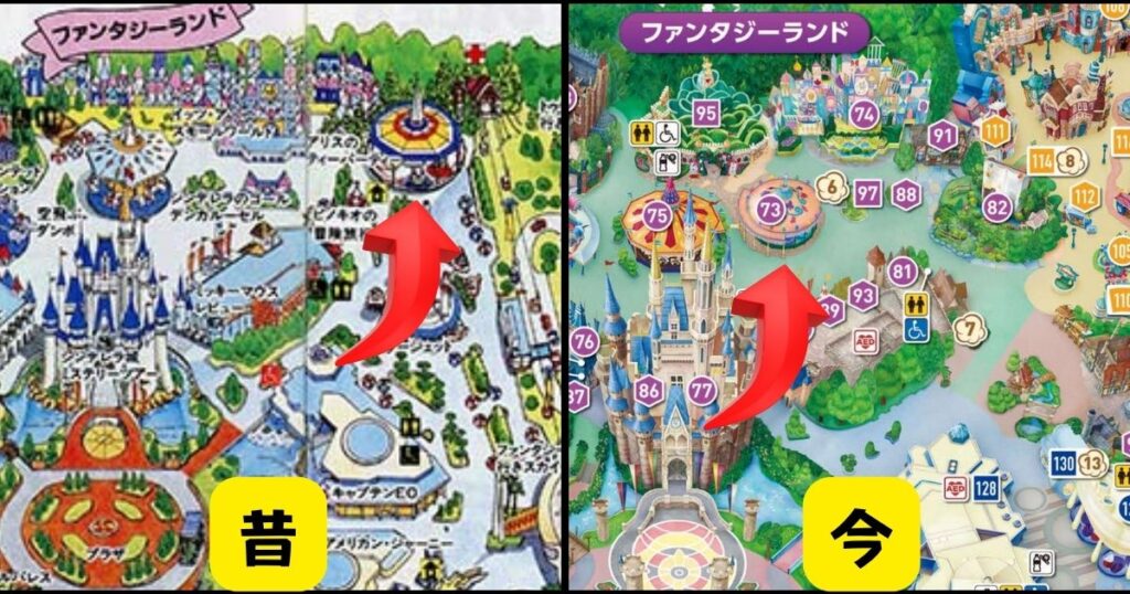 パークの地図を見くらべると、むかしのティーカップは外周に近い場所、今はお城のとなりにあります。