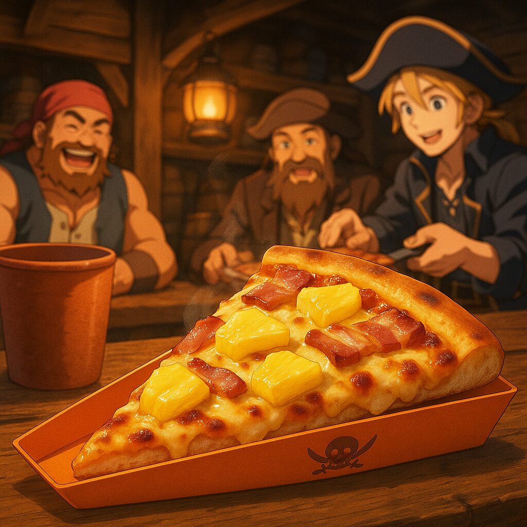 ベーコンのような塩気の強い肉は、航海のあいだの力の源です。そこに南の海を連想させるパイナップルを合わせると、 「海で働く海賊たちが、ちょっと贅沢に楽しむ一枚」というイメージになります。