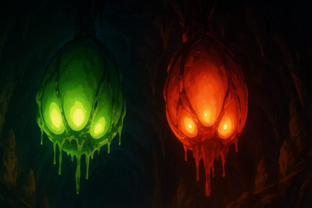 左前方の上あたりに、淡く脈うつ光を放つ卵(袋)が見えます。