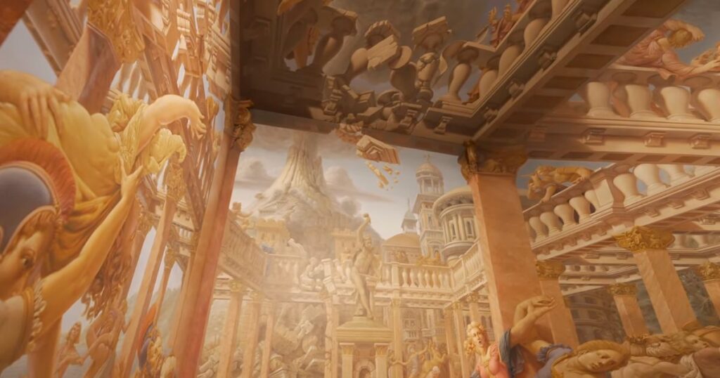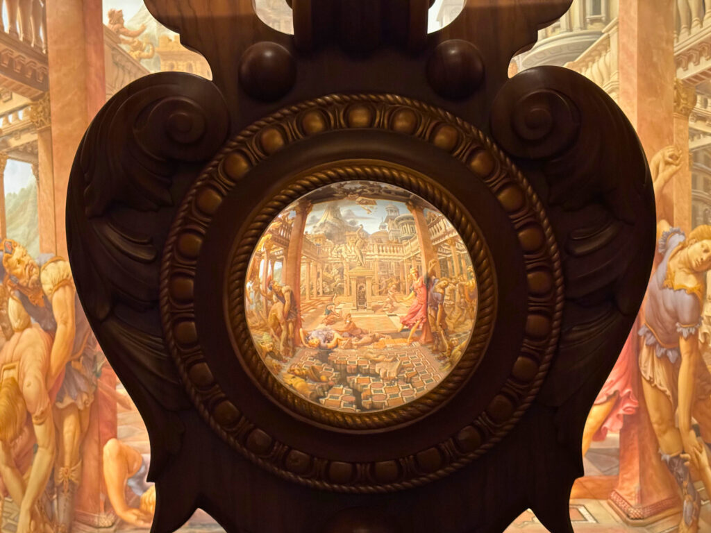 床・壁・天井に分かれて描かれた模様は、近くで見ると伸びていたりつぶれていたりして、