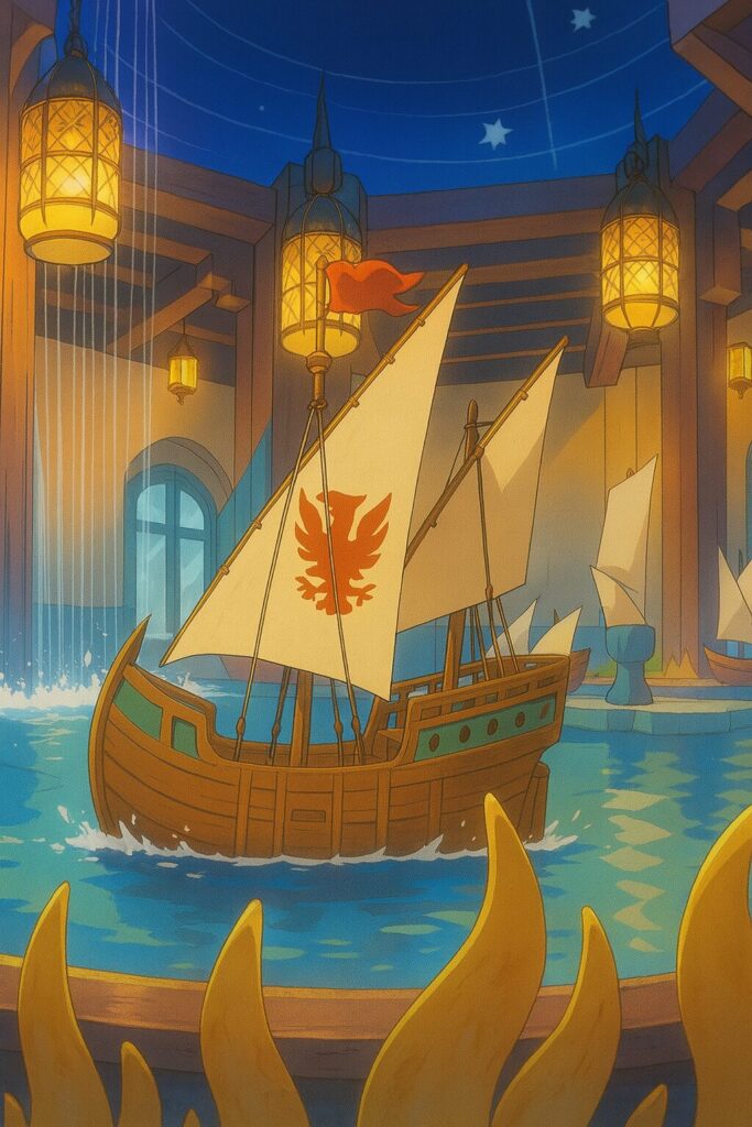 やわらかい光が水面にひろがり、そこに小さなガリオン船の模型が、そっと浮かんでいます。