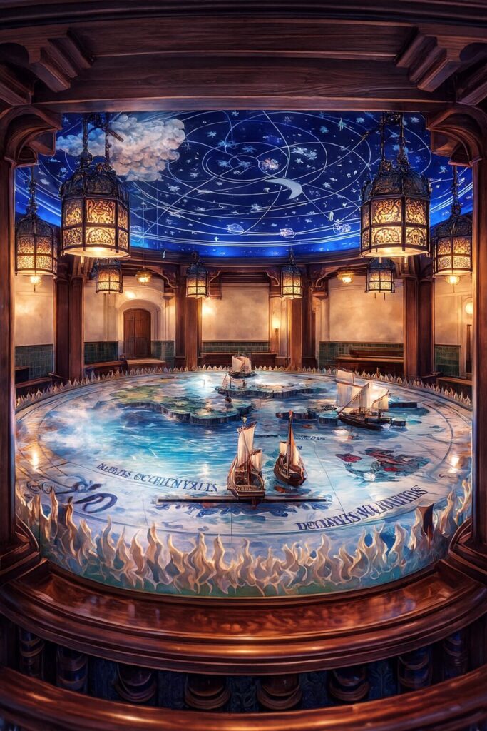 部屋の雰囲気:水の地図と小さな船がある、静かな航海室