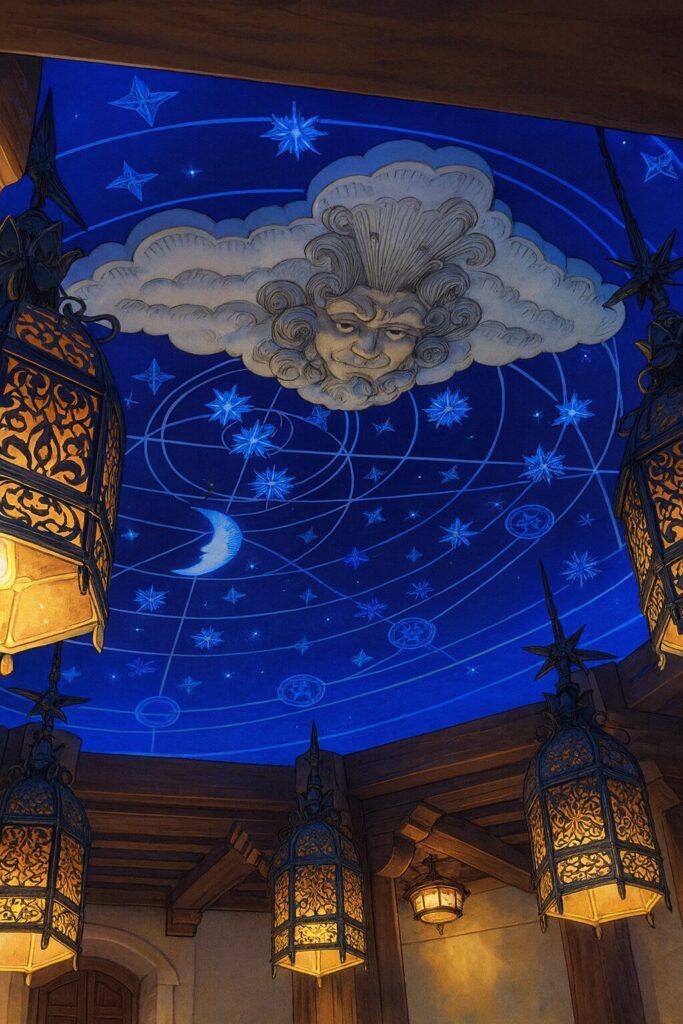 壁や天井には、星や雲、航海にまつわる模様が描かれていて、