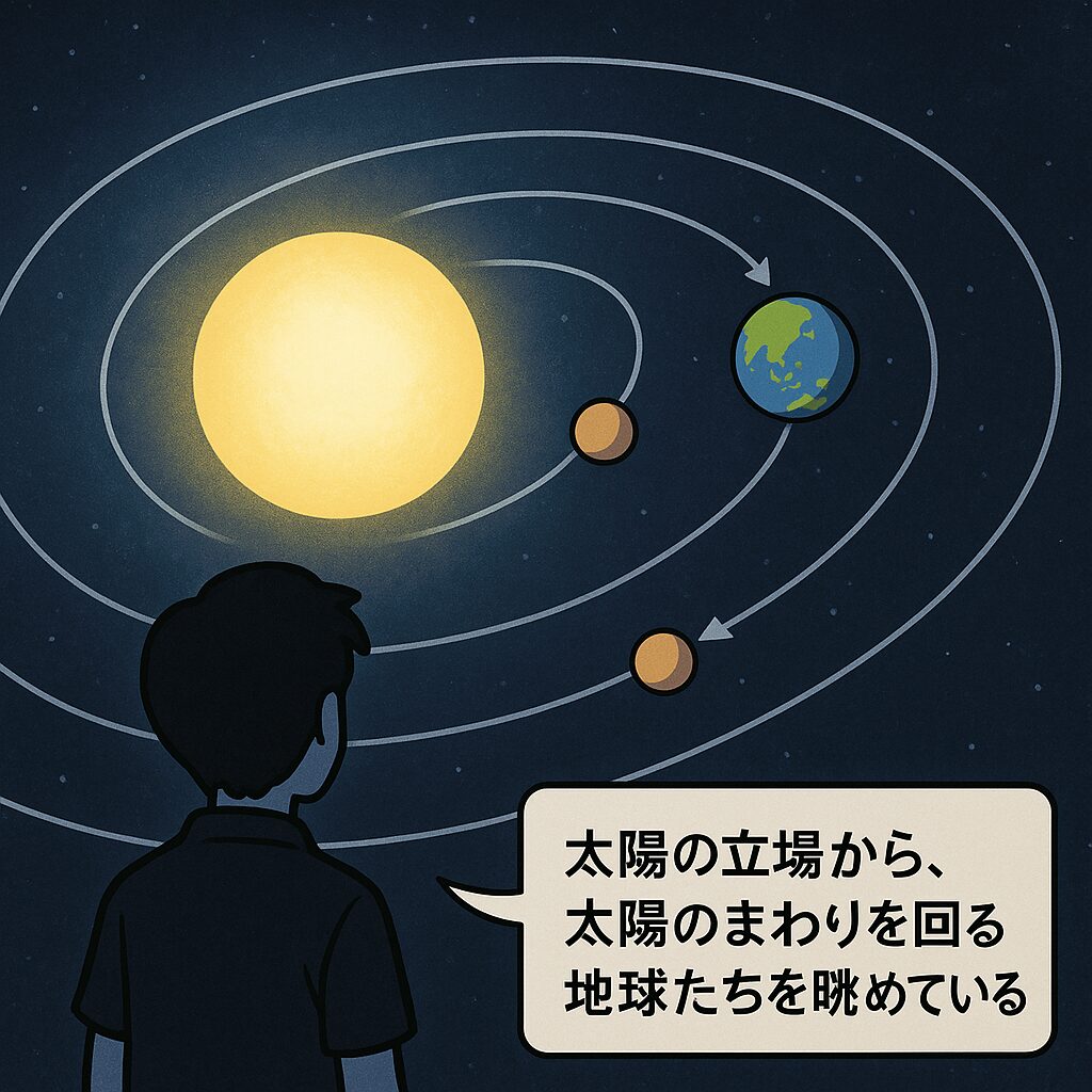 「自分は太陽の立場から、太陽のまわりを回る地球たちを眺めている」という見方です。