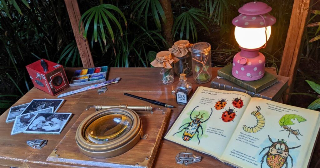 遺跡や自然の研究が進む机のそばに、ミニーのカメラが置かれています。