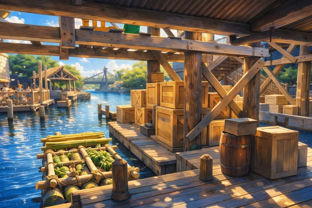 ドックにはこれから川上へ輸送される雑貨や荷物が積み上げられています。