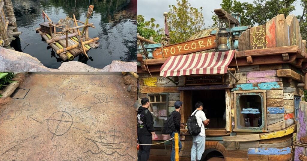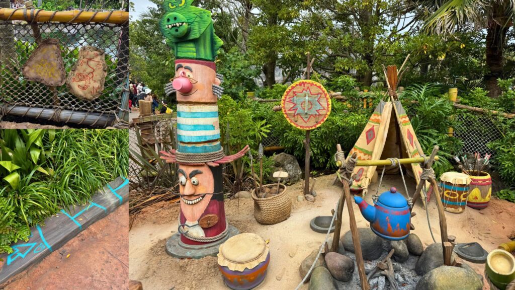 このエリアは「いつ来ても冒険の最中」という設定です。映画の続きではなく、今この場で作戦が進んでいます。だから掲示や合図、呼びかけは今日の作戦のためにあります。
