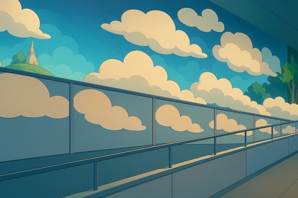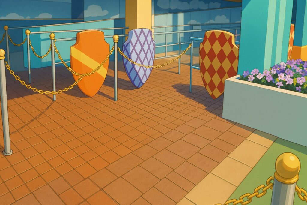 乗り場に近づくほどレンガが小さくなり、終盤はゆるい坂と雲のモチーフへ。Qライン全体が「地上→上空」へ心を連れていく設計です。