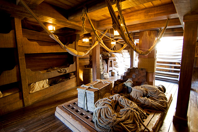 甲板の下には、船員の寝泊まりする部屋や、荷物を積み込む倉庫、調理スペースなど、大航海時代の生活空間がぎっしりと再現されています。