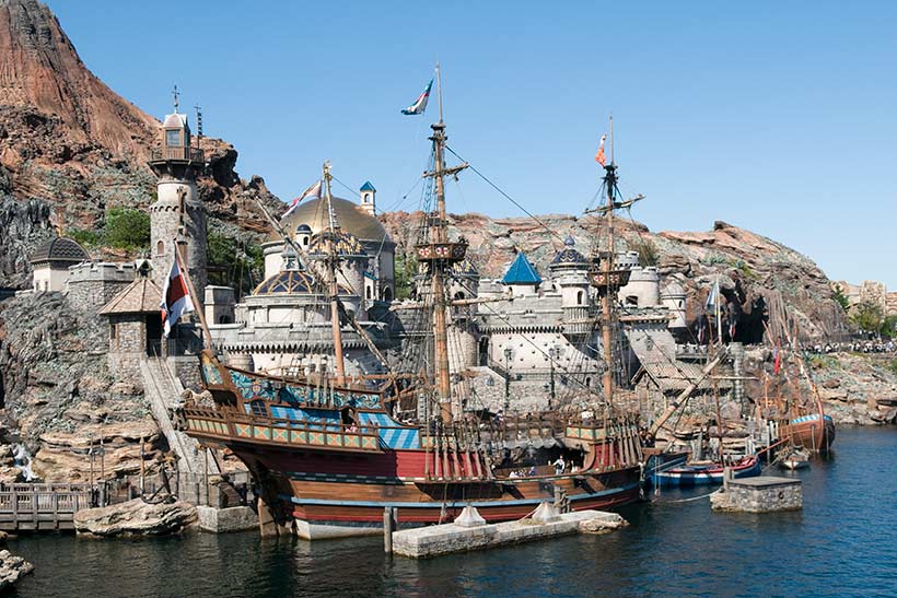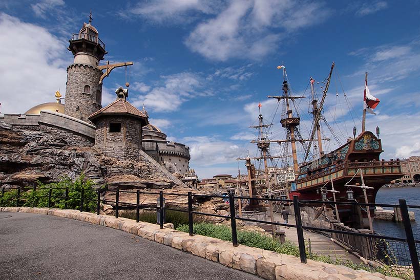 一つめは、入園してすぐの橋やプロメテウス火山側から、「港・砦・ルネサンス号」の三つを一度に眺めてみることです。港全体が一つの物語としてつながっていることが分かりやすくなります。
