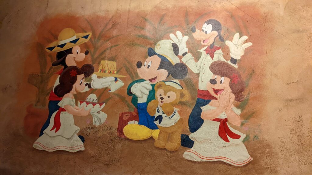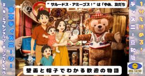 壁画は「到着 → 歓迎 → 贈りもの」の流れで、ダッフィーが町の人たちの“なかま”になっていく様子を教えてくれます。ダッフィーの帽子は、その友情のしるしです。