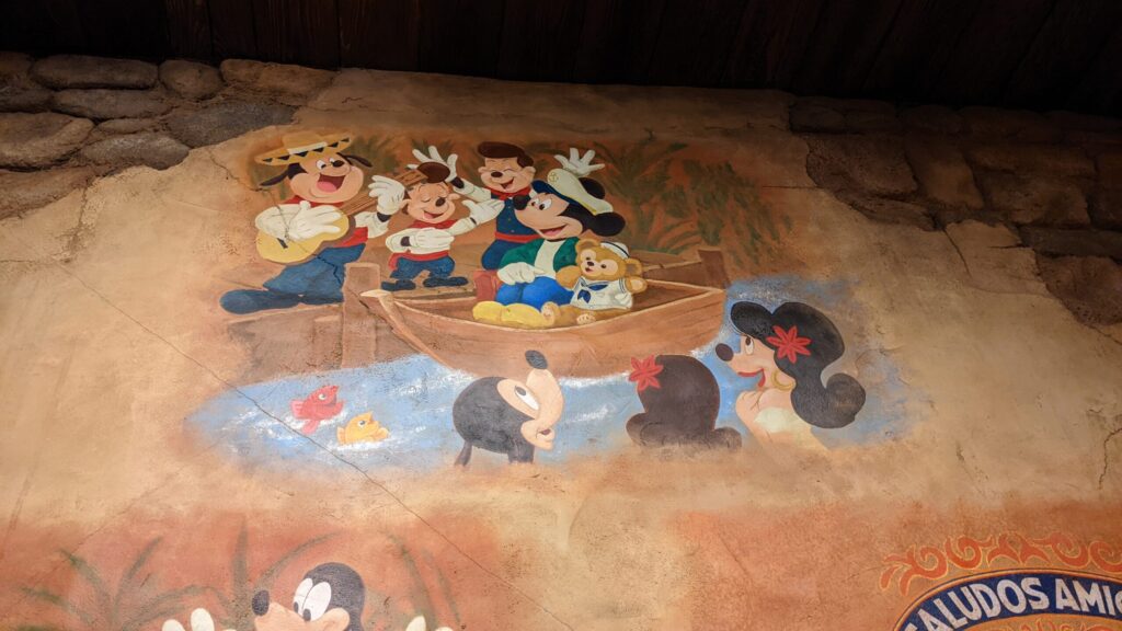 ロストリバーデルタの桟橋には、ダッフィーの「はじめての友だち」の物語が描かれています。