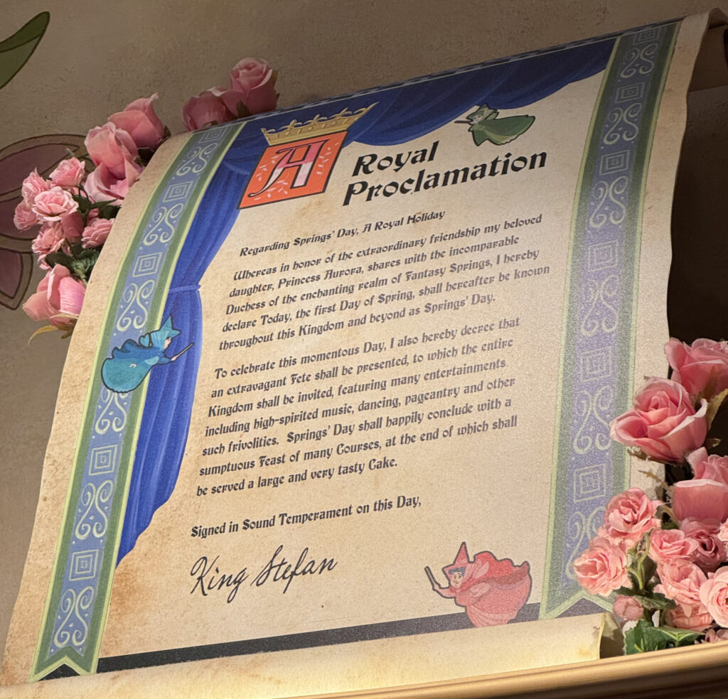王国の布告書には、ダッチェスとオーロラ姫の友情を讃える言葉が記されています。