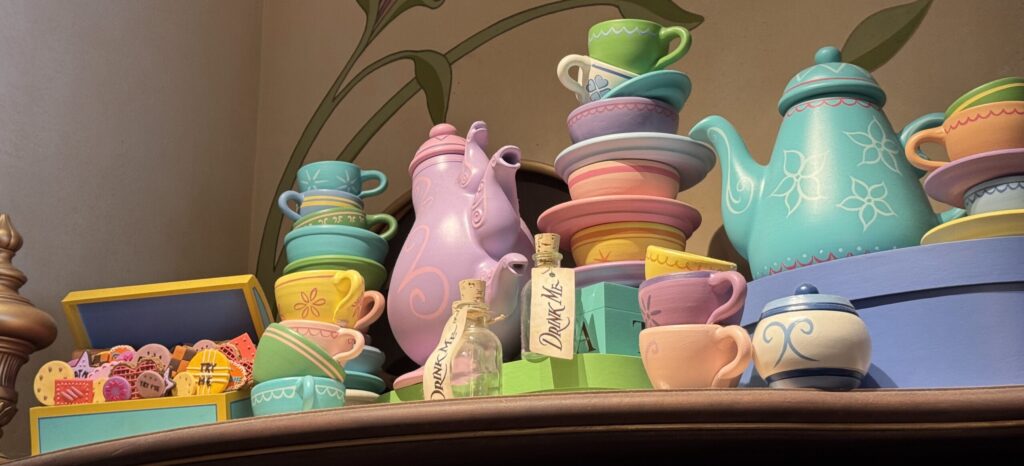 山積みのカラフルなティーカップやポットは、お茶会の合図。