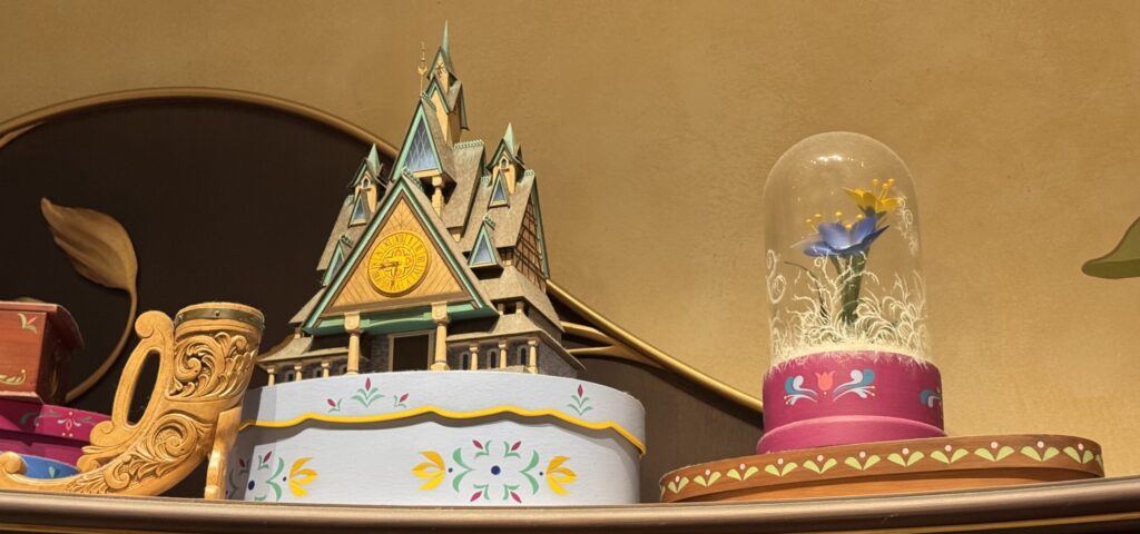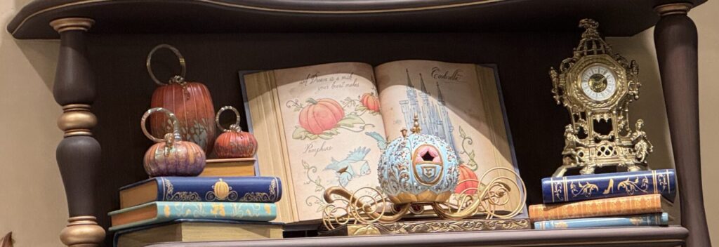 棚には、カボチャの馬車金の時計、そしてガラスのドームに収められた王冠が並んでいます。
