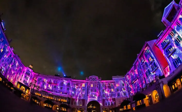 メディテレーニアンハーバーではホテルミラコスタの壁面に映像が映し出される環境演出が実施されます。